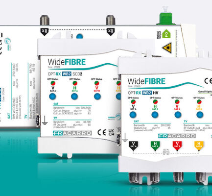 A single optical transmitter accepting 2 wideband satellites plus terrestrial, offering a combined 2SAT output over a single fibre cable with a split ratio of 1:64. Choice of two compatible WB2 receivers.