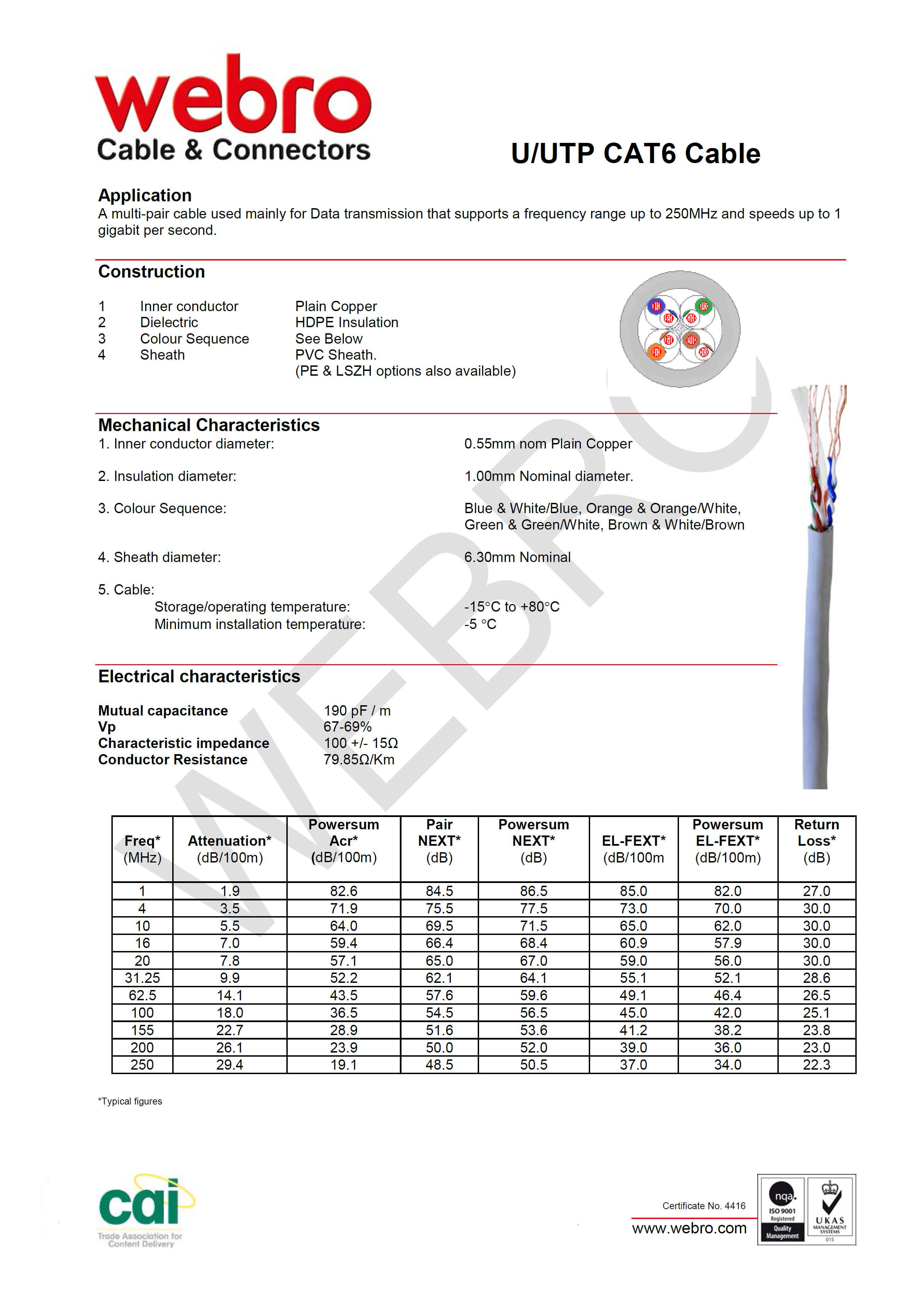 This CAT6 Cable from Webro is a multi-pair cable used mainly for Data transmission that supports a frequency range up to 250MHz and speeds up to 1 gigabit per second.