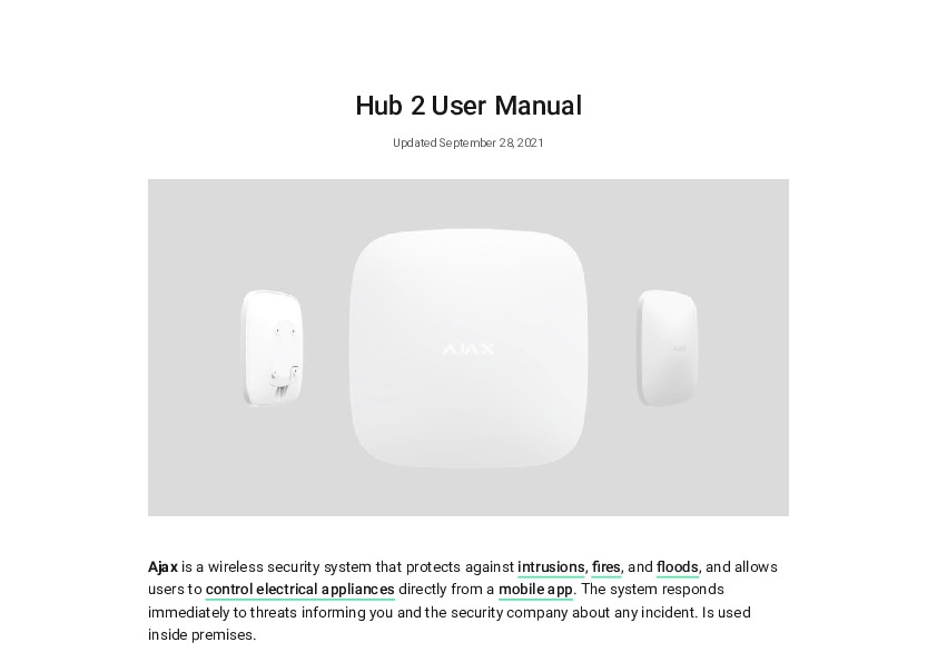 Complete set: Ajax Hub 2 intelligent control panel / SmartBracket mounting panel / Power cable / Ethernet cable / Installation kit /SIM card depending on region) / User’s guide