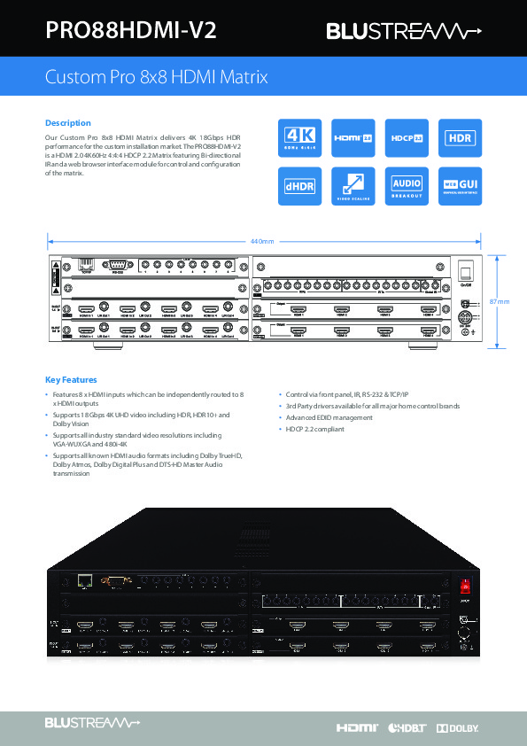 The Custom Pro 8x8 HDMI Matrix delivers 4K 18Gbps HDR performance for the custom installation market. It is a HDMI2.0 4K60Hz 4:4:4 HDCP2.2 Matrix featuring Bi-directional IR and a web browser interface module for control and configuration of the matrix.