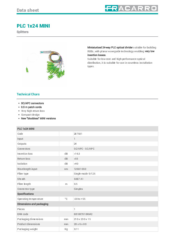 Miniaturized 24-way PLC optical divider suitable for building ROEs, with planar waveguide technology enabling very low insertion losses.