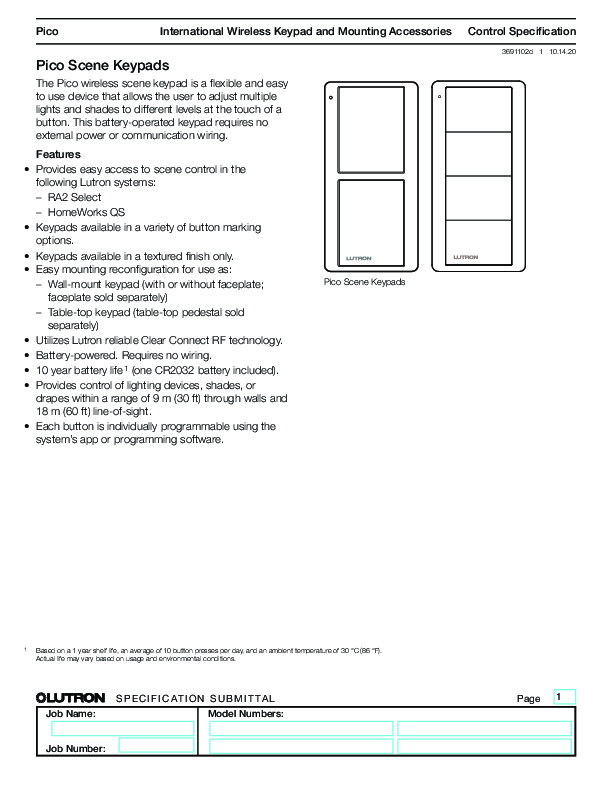 The Pico wireless scene keypad is a flexible and easy to use device that allows the user to adjust multiple lights and shades to different levels at the touch of a button. This battery-operated keypad requires no external power or communication wiring.