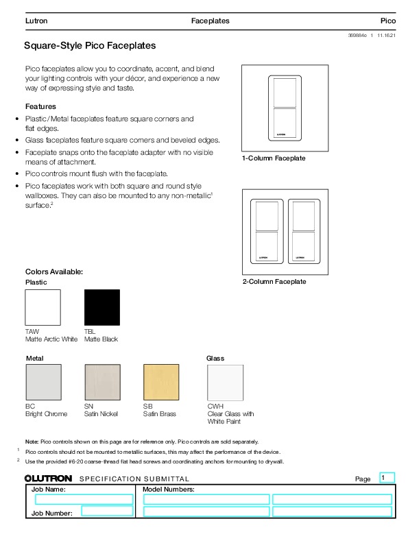 Pico faceplates allow you to coordinate, accent, and blend your lighting controls with your décor, and experience a new way of expressing style and taste.