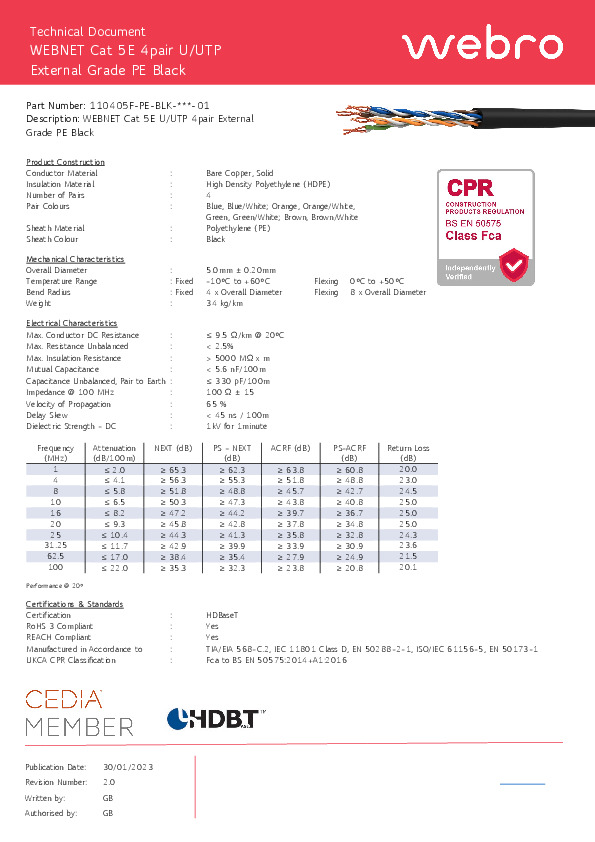 WEBNET Cat 5 U/UTP cable is tested and certified by the HDBaseT alliance. The cable has 4pairs and is unscreened, and is ideal for clipping around fences, up exterior walls, or along roofs due to it's polyethylene, water and UV resistant black outer sheath.