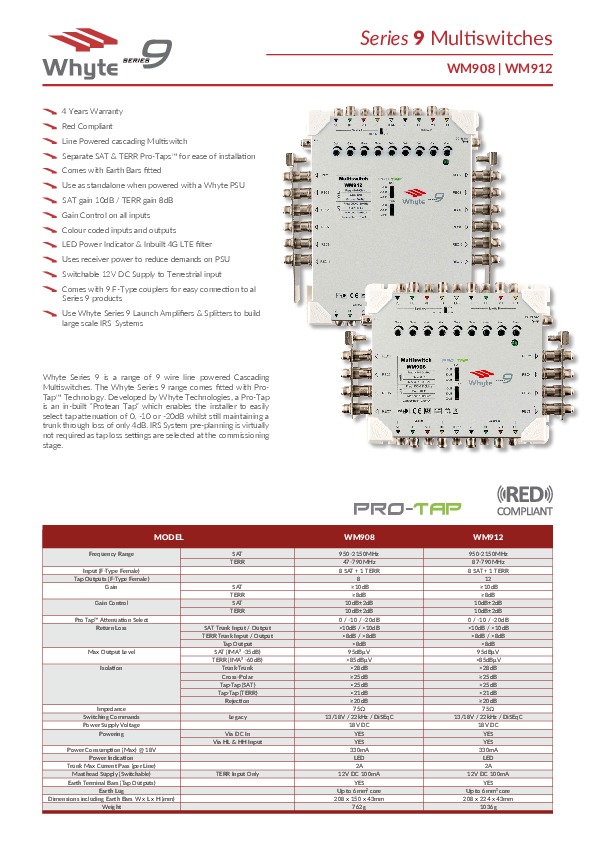 The Series 9 12-Way Standalone Multiswitch is is 9 wire line powered Cascading Multiswitch. It comes fitted with Pro-Tap Technology which enables the installer to easily select input tap losses of 0-10 or -20dB whilst maintaining a trunk through loss of only 4dB.